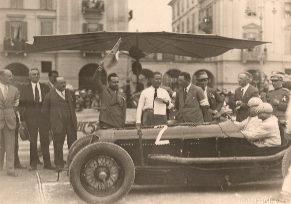 The Magistrate of Cuneo signals the start of the Cuneo-Colle della Maddalena Hill Climb for pilot Luigi Fagioli on 29 June 1930. Driving a 3000cc Maserati, Fagioli finished second overall.