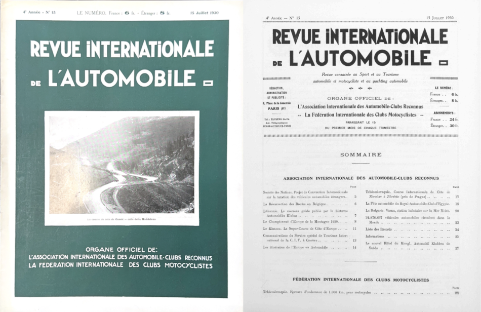 This century-old AIACR quarterly journal was a leading publication for global motoring. This issue (No. 15) is notable for its comprehensive coverage of the inaugural European Hill Climb Championship.